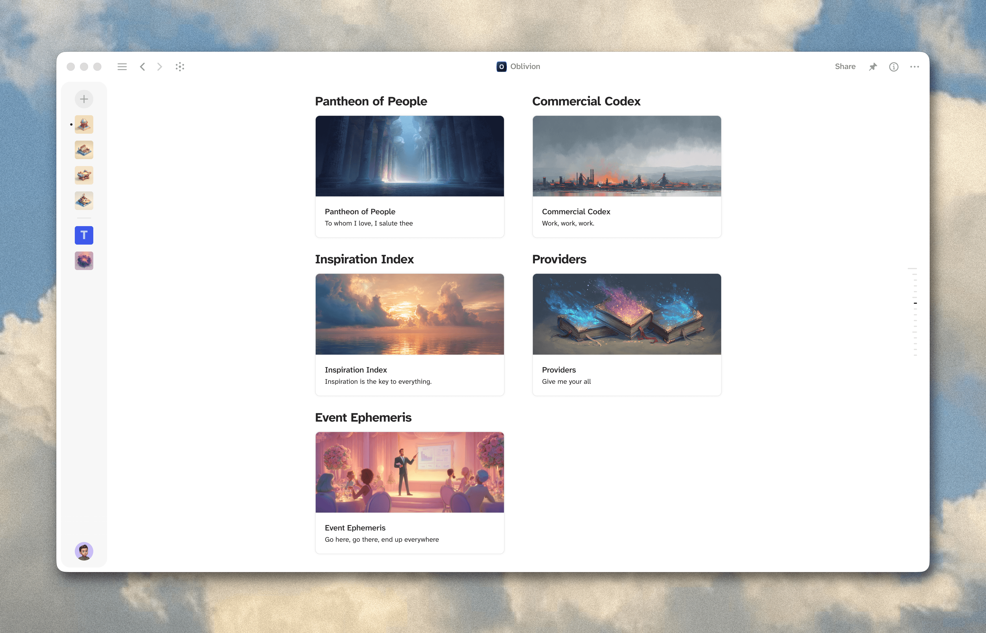 My whole system is called Oblivion. The name is a nod to The Umbrella Academy. There's a moment in season three where the characters enter Hotel Oblivion, a gateway to another world entirely. That's what my knowledge system feels like. An infinite space that can always grow, always evolve. A threshold you cross into something bigger than what you had before.