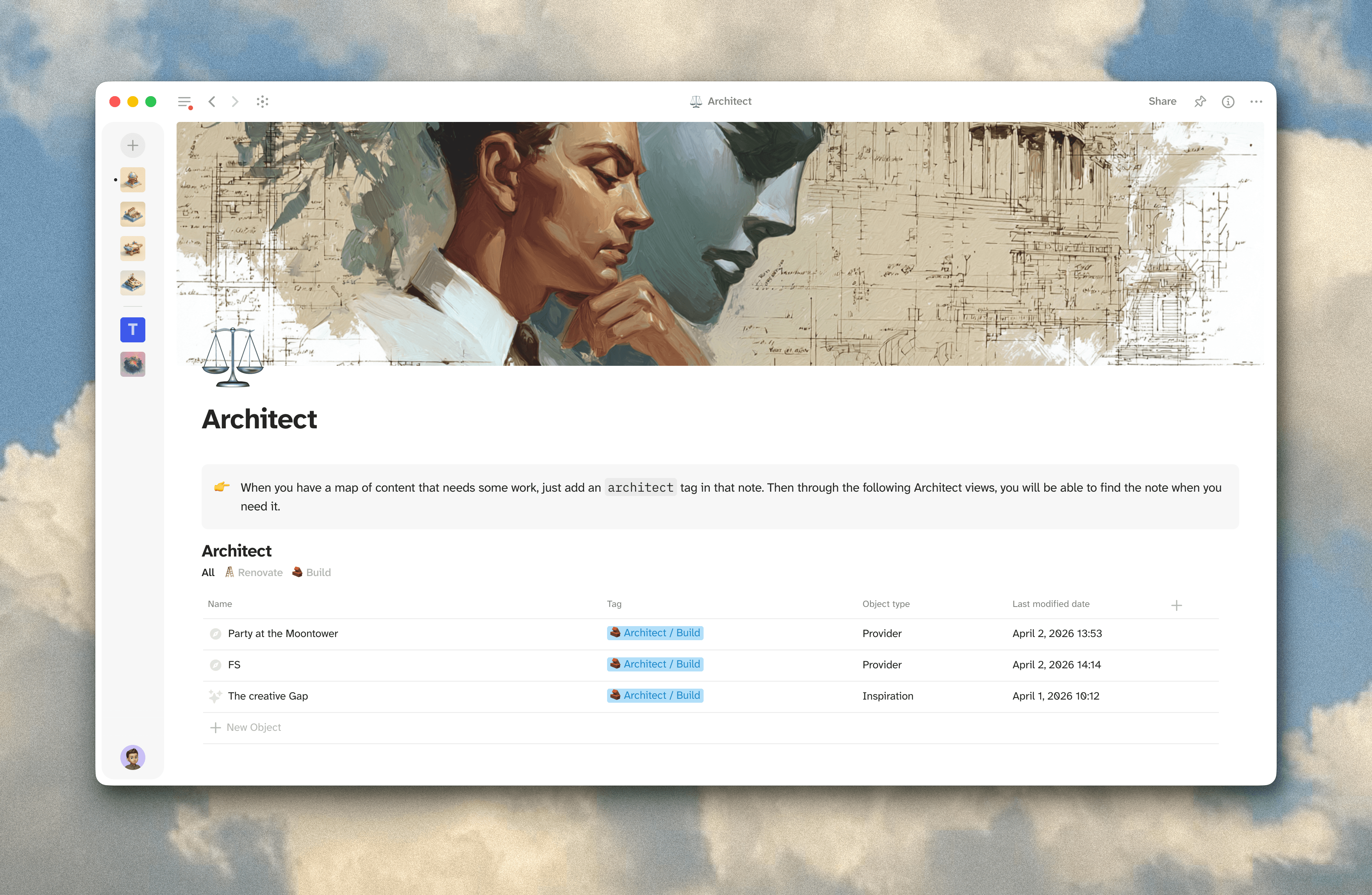 The one I use most is Architect and Gardener mode. This comes from Ideaverse, an Obsidian-based PKM course I took a lot of inspiration from. The concept is simple: every item in my knowledge base can be tagged with a mode. When I come across something I want to build out or improve but I don't have the time right now, I tag it as an Architect build.