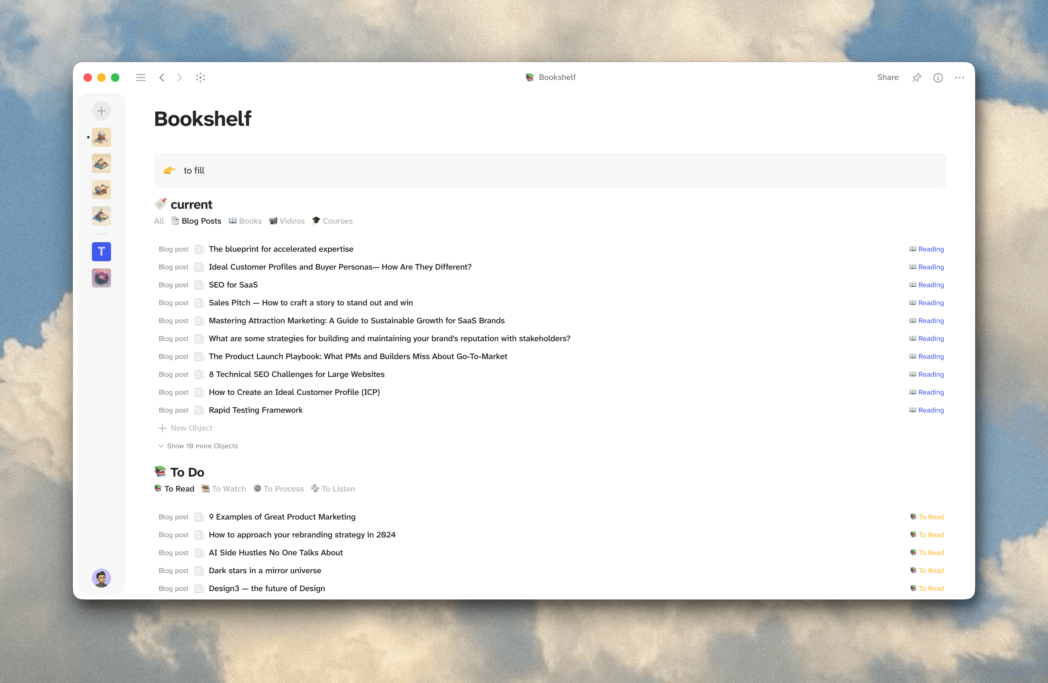 The bookshelf isn't literally a bookshelf. It's where any piece of knowledge material lives that I want to process. Blog posts, videos, podcasts, articles, books, webinars, research papers. Anything I'm currently reading through or want to get to.