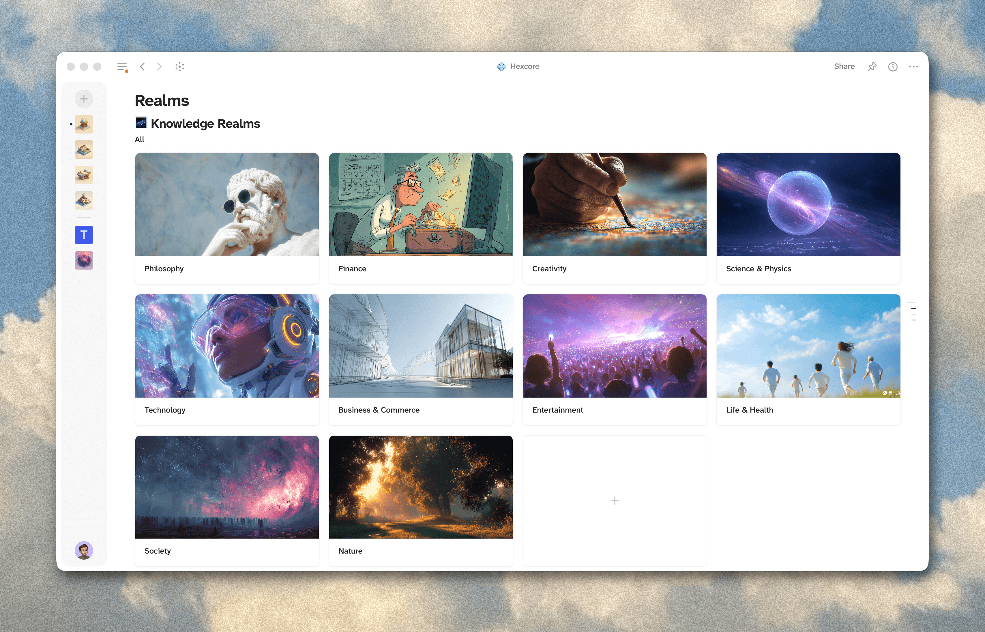 Realms sit at the very top. Broad, almost vague on purpose. My current realms are philosophy, finance, creativity, science and physics, technology, business and commerce, entertainment, life and health, society, and nature. I rarely create new ones and I've never retired one. They work as organizational structure rather than containing deep information themselves. The continents on the map. They tell you which part of the world you're in, but the interesting stuff happens at street level.