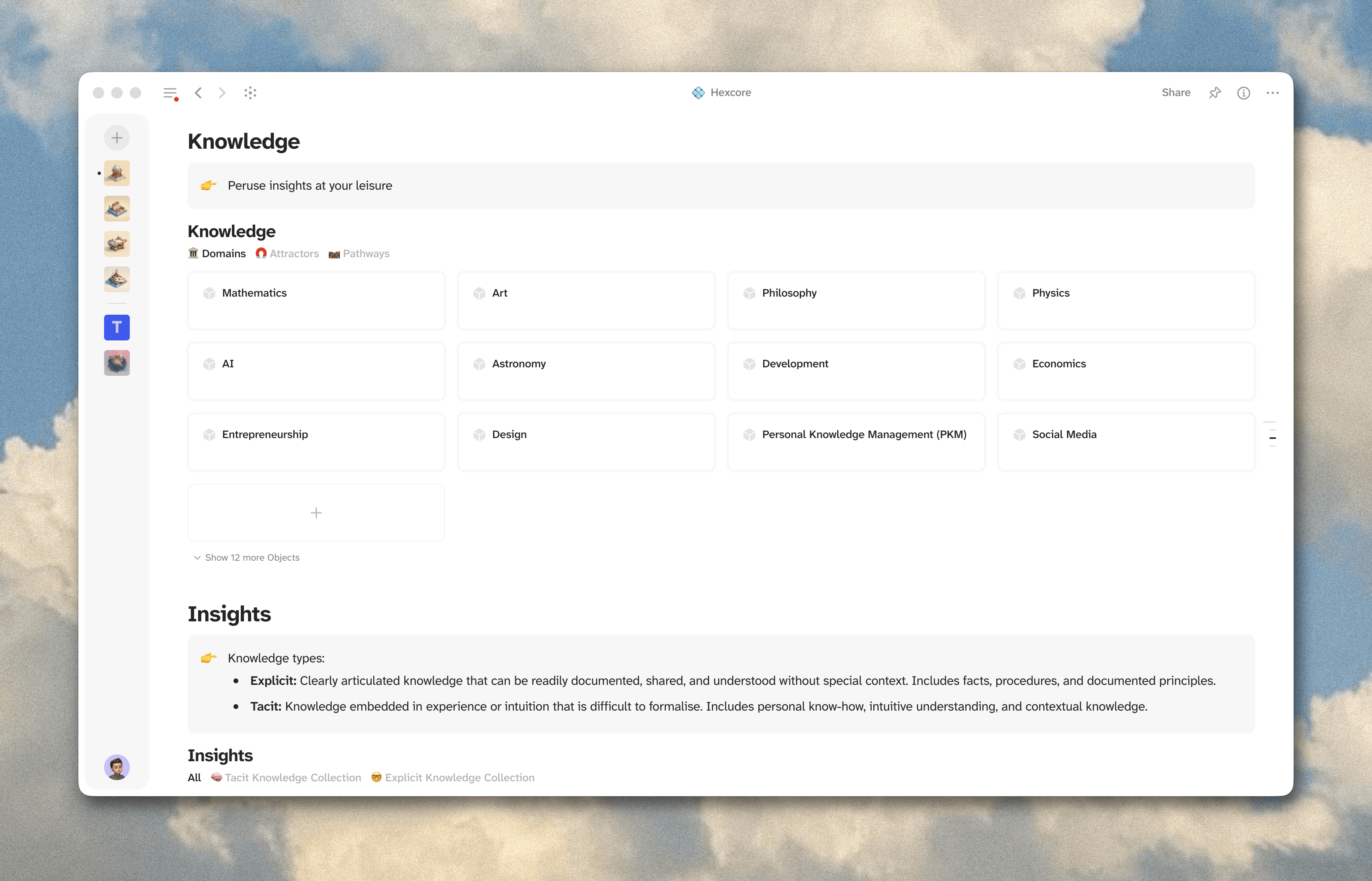 Insights are the atomic level. Free-floating, bite-sized pieces of knowledge that can attach at any level. A domain, an attractor, a pathway, or just floating independently. I split them into explicit insights (facts, procedures, documented principles) and tacit insights (things that need more intuitive understanding and context to make sense of). An insight might link to an attractor, a domain, and a source all at once. They're stable once created.