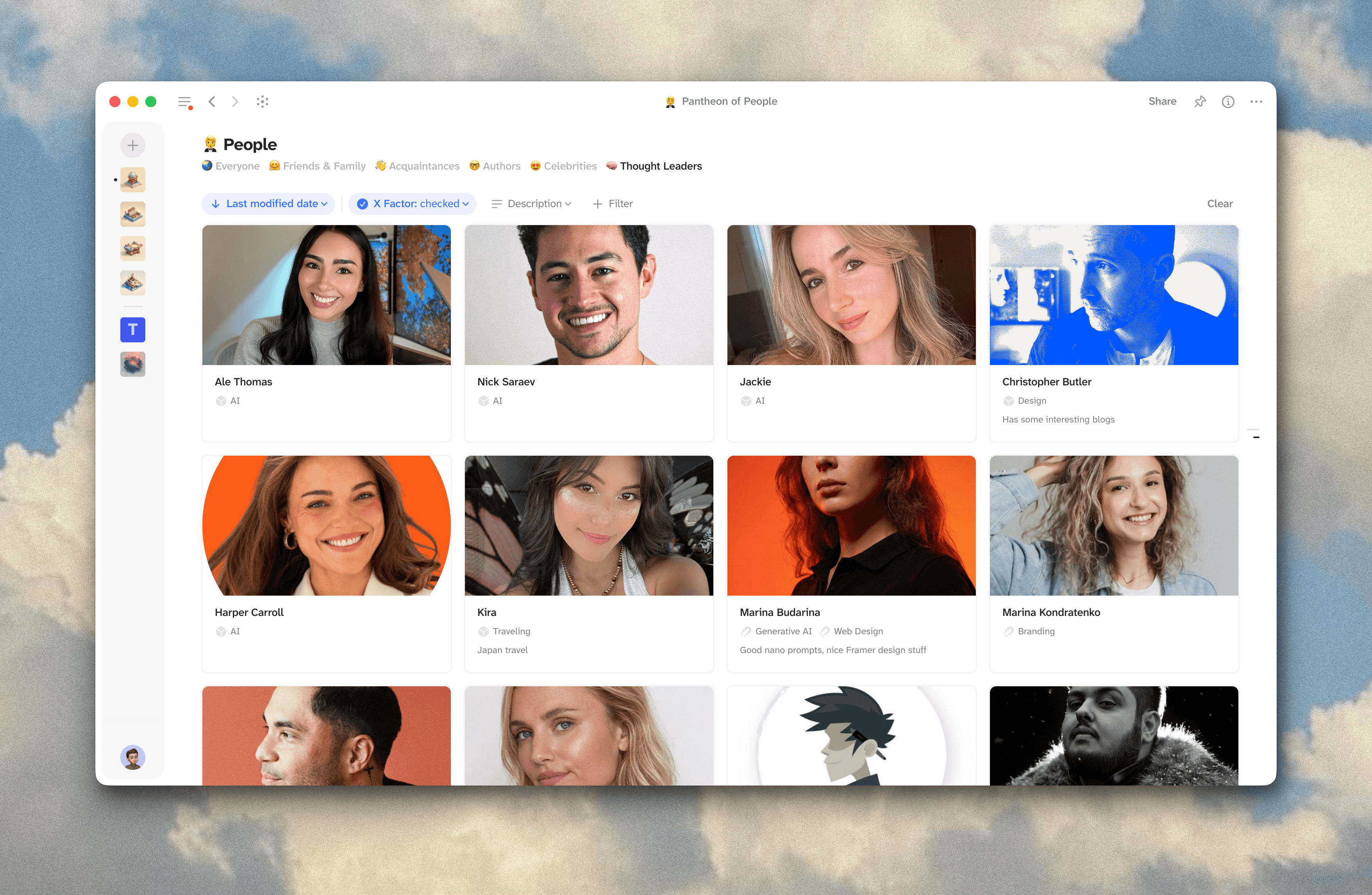 The Pantheon of People is my personal CRM for people I find inspiring. Designers whose work I want to follow, thinkers whose ideas keep showing up in my reading, friends and family with birthdays and notes. It links back into Atlas whenever someone's work connects to a domain or insight.