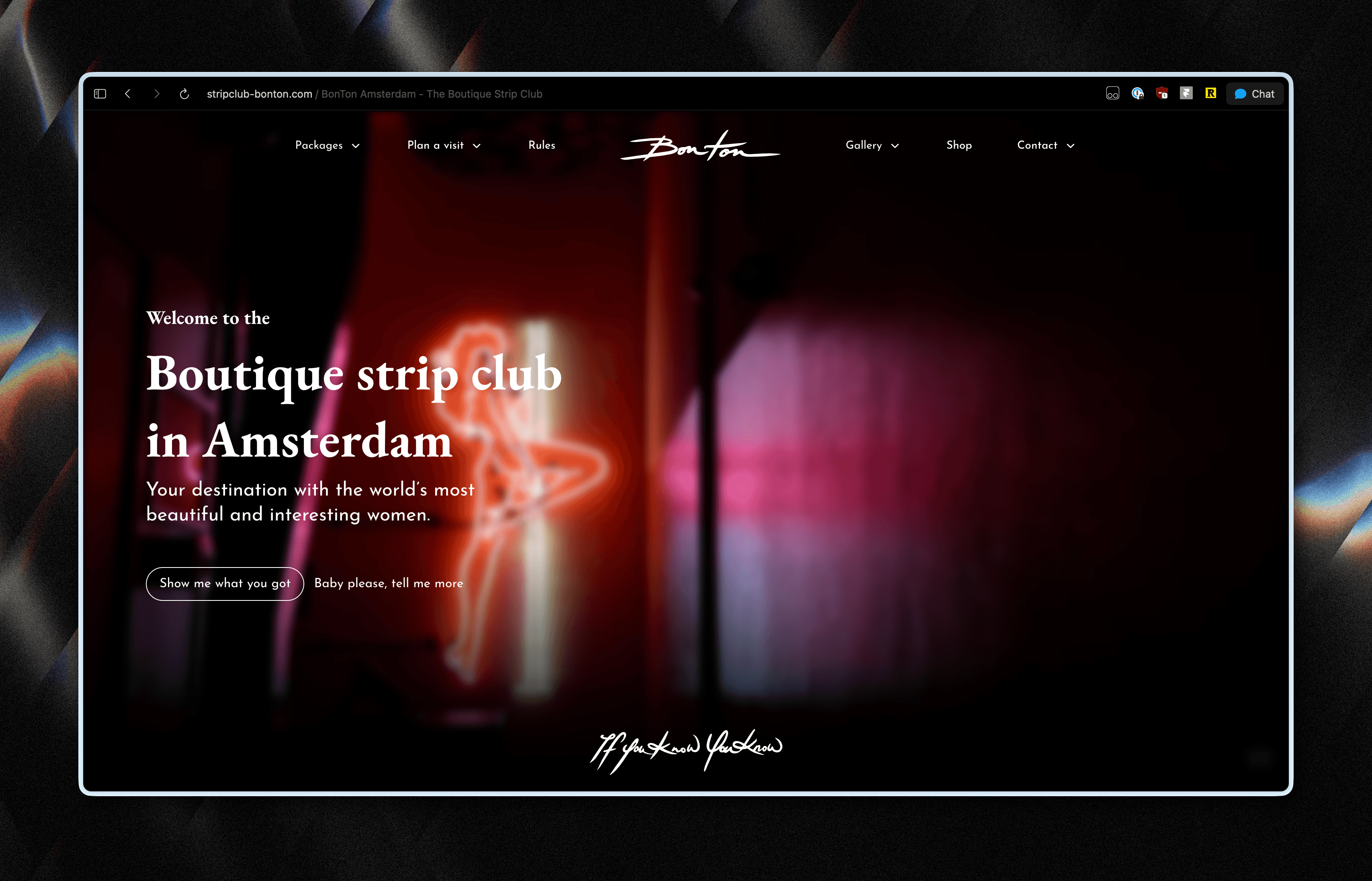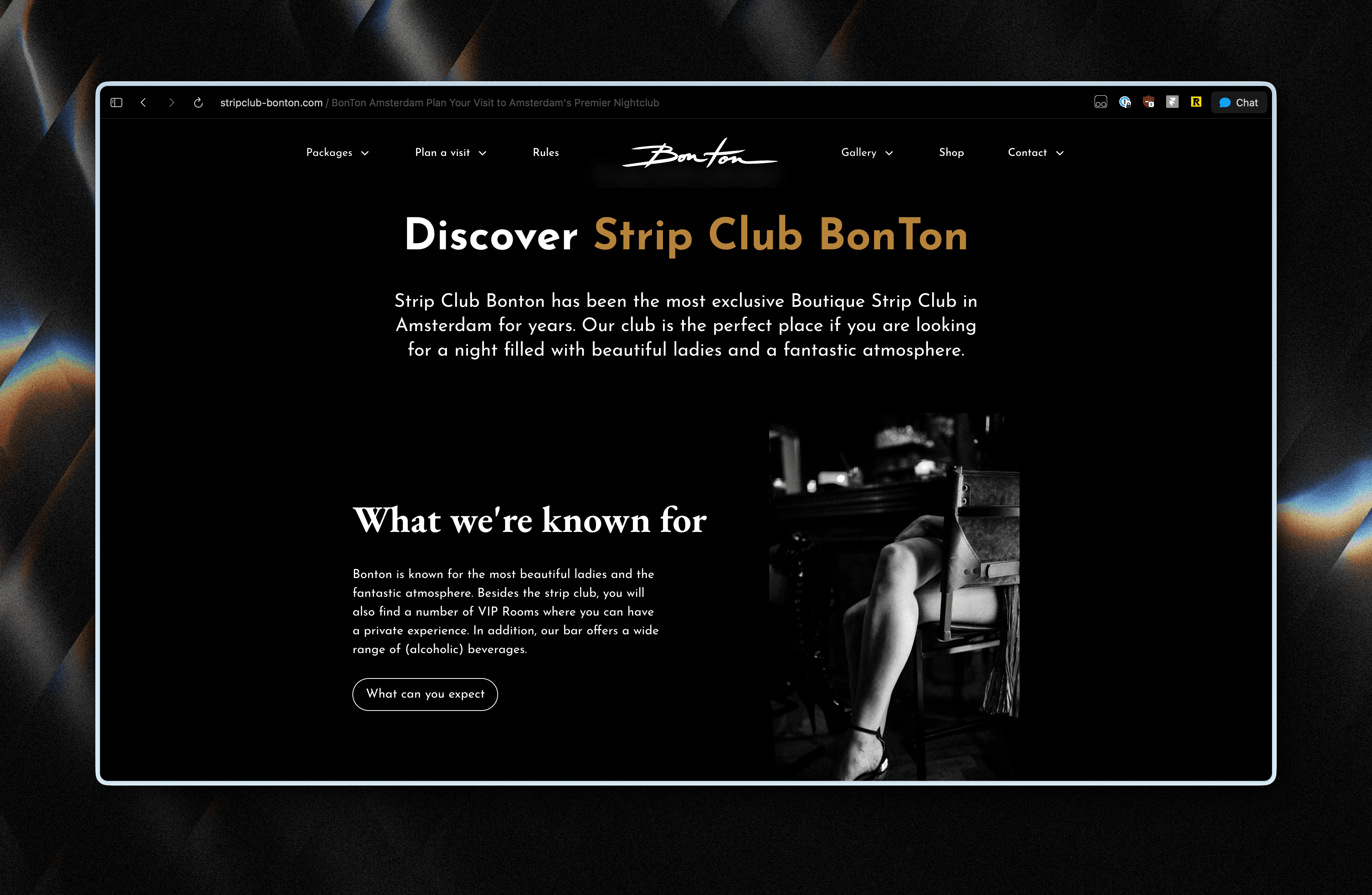 The club site (stripclub-bonton.com) is the visitor-facing one. Dark, warm, luxurious. Opening hours, location, events. The visual direction is dark backgrounds with warm accents. It should feel like walking into the venue before you've actually walked in.
